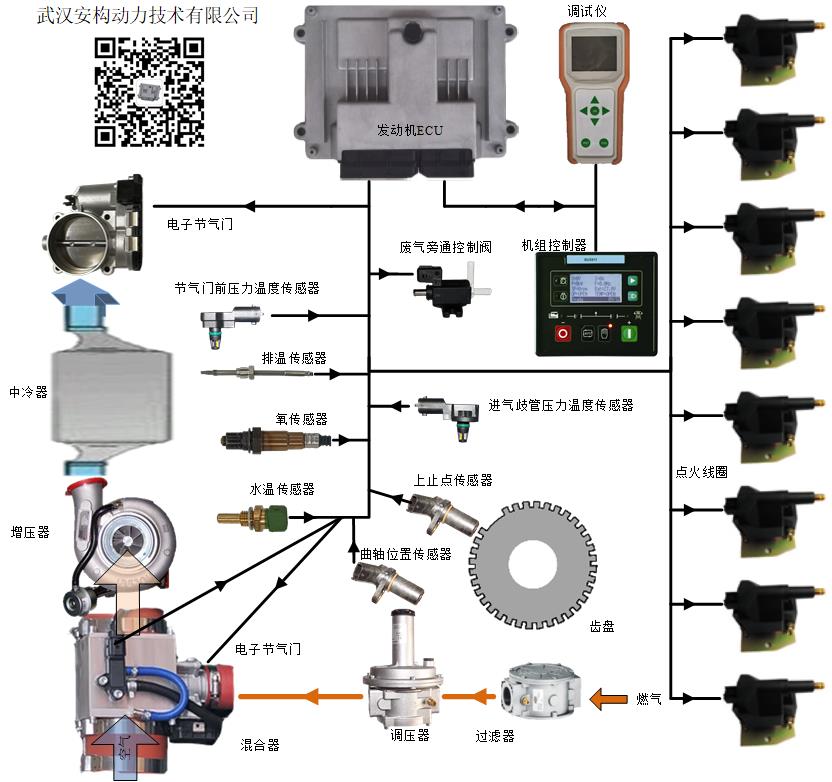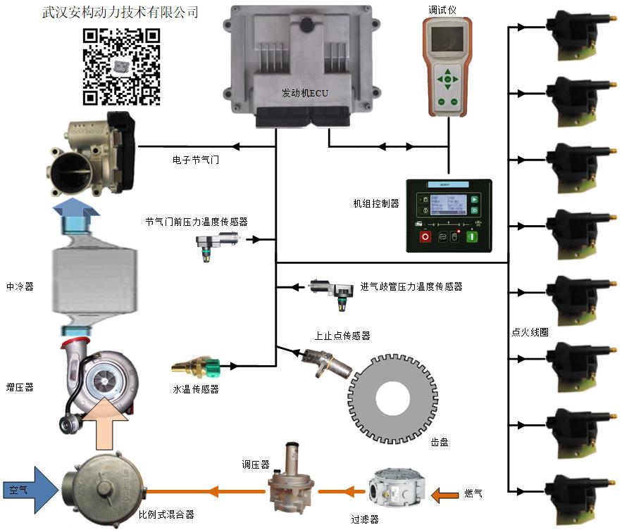 武汉安构动力技术有限公司针对发电、固定动力应用开发了燃气发动机电控系统。包括自主研发的ECU、定做的线束和文丘里混合